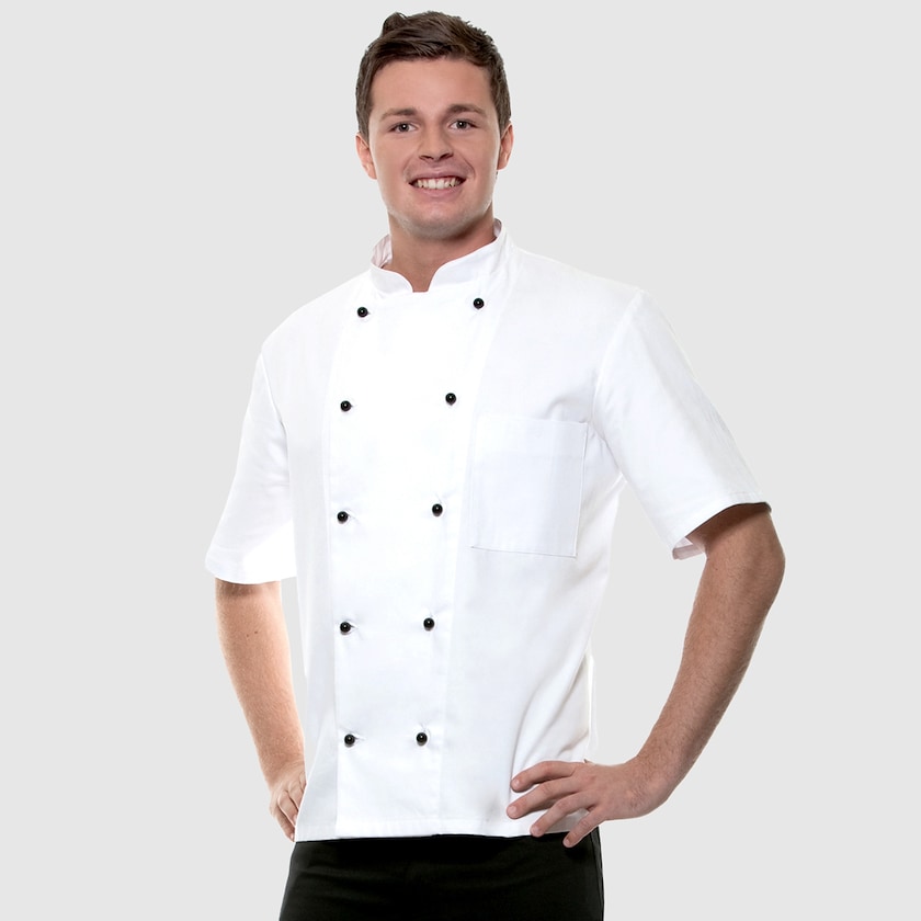Kurzärmliche Kochjacke für Herren. Kochjacke mit 10 losen Knöpfen (im Lieferumfang enthalten). Auf der linken Brust befindet sich eine Brusttasche. Die Kochjacke verträgt Industriewäsche bis zu 95 °C. Auch als Damenmodell erhältlich. Gibt es auch als Damenmodell.