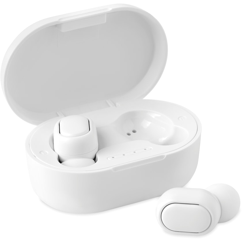 Kabelloser Kopfhörer aus recyceltem ABS-Kunststoff. Die Kopfhörer sind vom Typ True Wireless Stereo 5.0 und verfügen über einen eingebauten Akku, der für ca. 4 Stunden Spielzeit reicht. Die Aufbewahrungsbox dient auch als Ladestation. Micro-USB-Kabel im Lieferumfang enthalten.