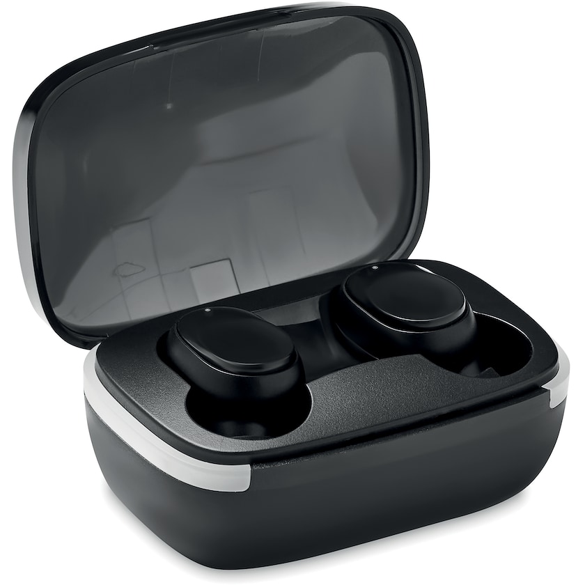 Set drahtloser Kopfhörer. Die Kopfhörer sind vom Typ True Wireless Stereo 5.0. Die Spielzeit beträgt ca. 3 Stunden. Micro-USB-Kabel enthalten. Die Aufbewahrungsbox fungiert auch als Ladestation.