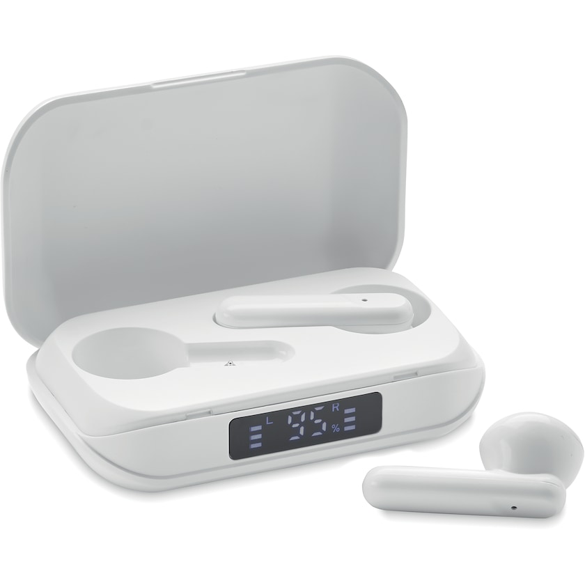 Kabellose Kopfhörer aus recyceltem ABS. Die Kopfhörer verfügen über Stereoklang, ein eingebautes Mikrofon und ein LCD-Display, das den Ladezustand anzeigt. Automatisches Pairing. Typ-C-Ladekabel und Ladestation im Lieferumfang enthalten.