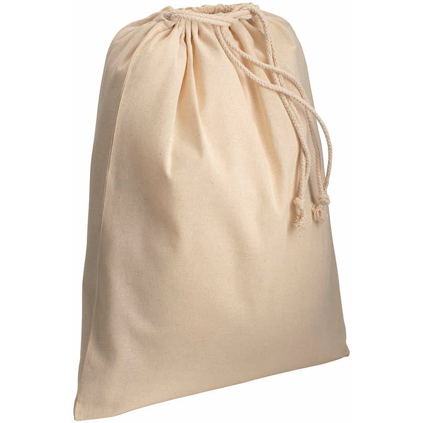 Großer Baumwollbeutel aus 120 g Baumwollstoff. Der Beutel ist naturfarbend und wird mit einem Zugverschluss versehen.