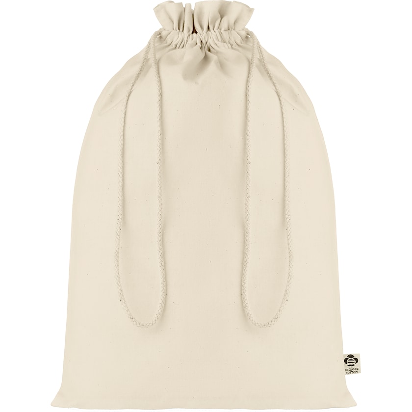 Großer Geschenkbeutel aus Bio-Baumwolle. Der Beutel besteht aus einem naturfarbenen 105-Gramm-Stoff. Auf der einen Seite befindet sich ein Etikett, das anzeigt, dass der Beutel aus Bio-Baumwolle besteht.