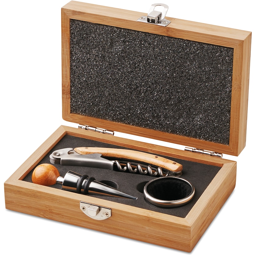 Kleines Weinset aus Edelstahl und Bambus. Ein elegantes Set für alle, die eine Leidenschaft für Wein haben. Ihr Logo kann mit Druck oder Gravur auf der Aufbewahrungsbox platziert werden.
