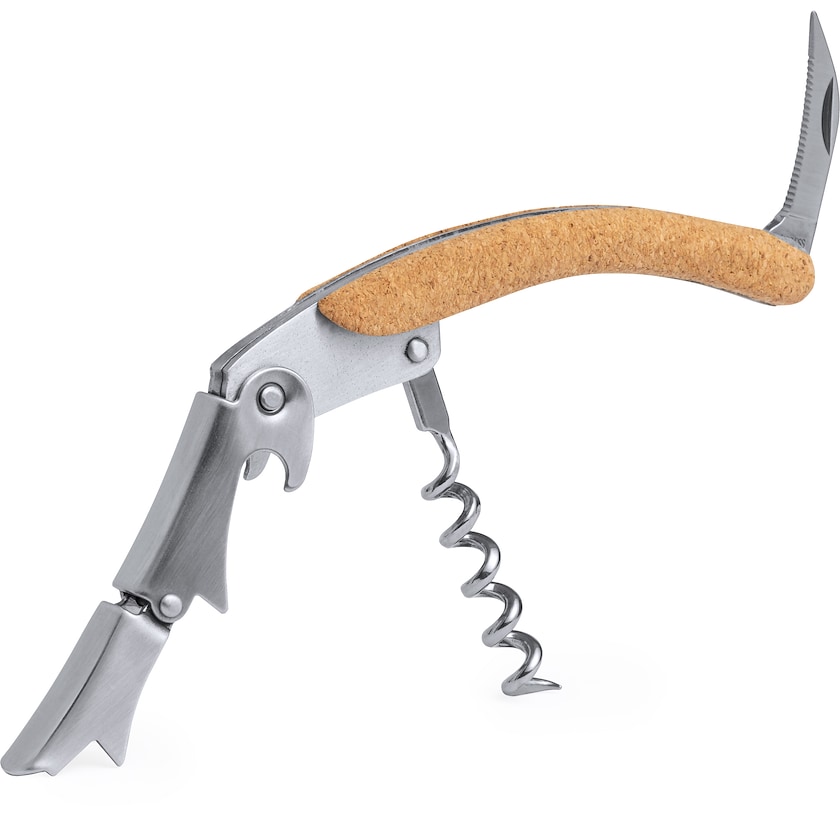 Weinöffner aus Edelstahl und Kork. Die Markierung erfolgt mittels Lasergravur. Ein exklusiver Weinöffner mit einzigartiger Optik.