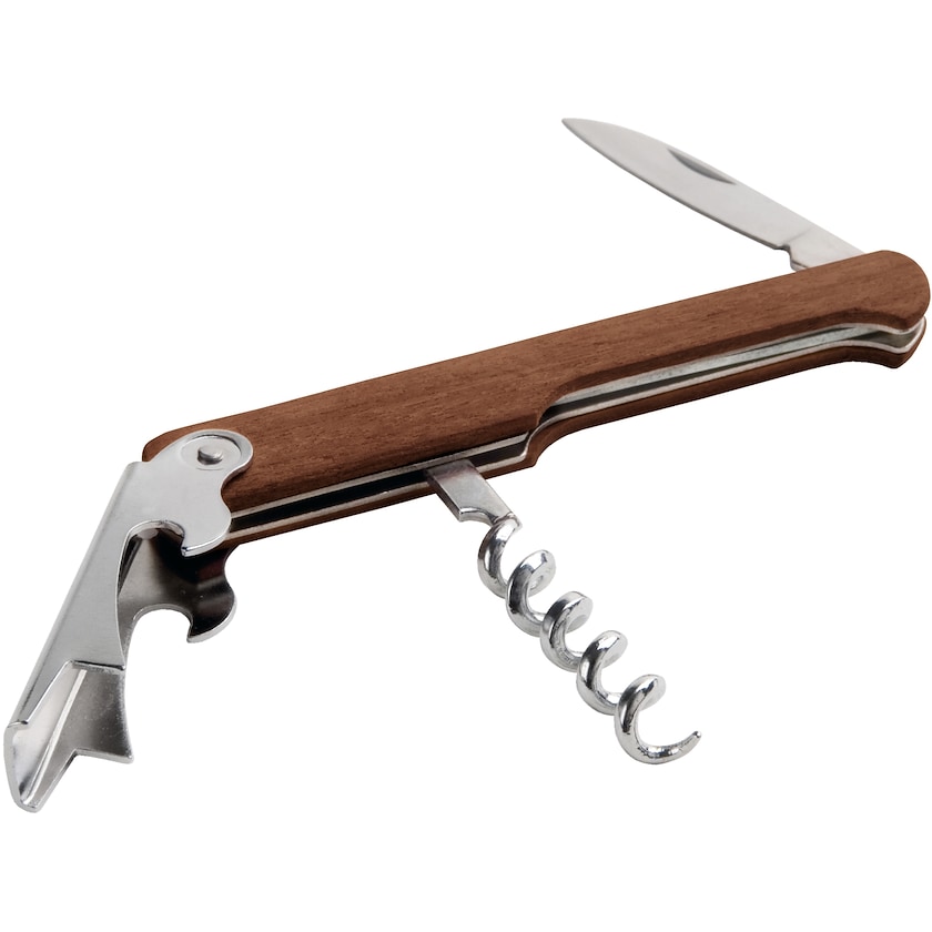 Eleganter Korkenzieher aus Holz und Stahl. Der Korkenzieher hat zudem einen Flaschenöffner sowie ein kleines Messer. Bestellen Sie Korkenzieher aus Holz zum Bedrucken bei Axon Profil!