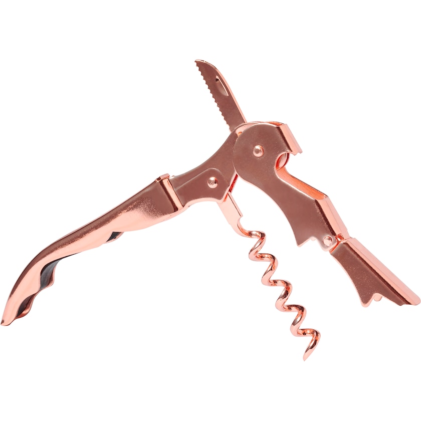 Weinöffner aus Edelstahl mit edler Kupferbeschichtung. Die Beschriftung erfolgt mittels Lasergravur.