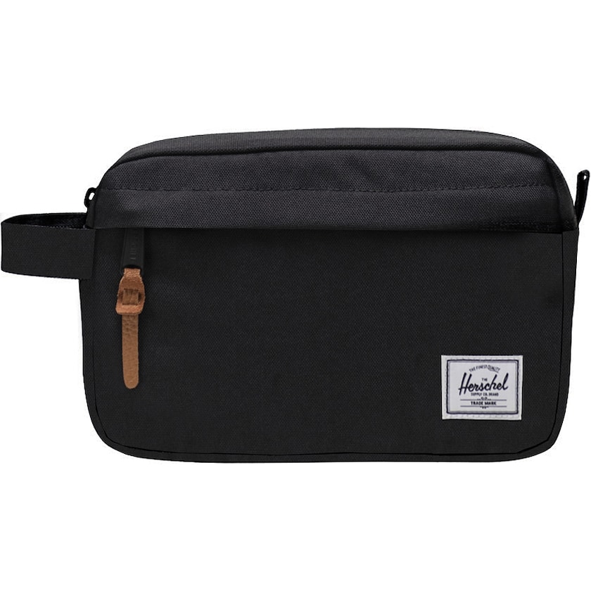 Umweltfreundliche Kulturtasche der amerikanische Marke Herschel. Der Stoff besteht zu 100 % aus recyceltem Polyester. Im Inneren befindet sich eine Netztasche für kleinere Gegenstände.