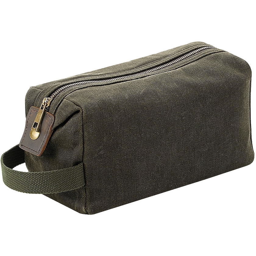 Kulturbeutel aus gewachstem Baumwollstoff mit Details aus echtem Leder. Innen befinden sich mehrere kleine Fächer und ein Reißverschlussfach. Ein besonders hochwertiger Kulturbeutel.