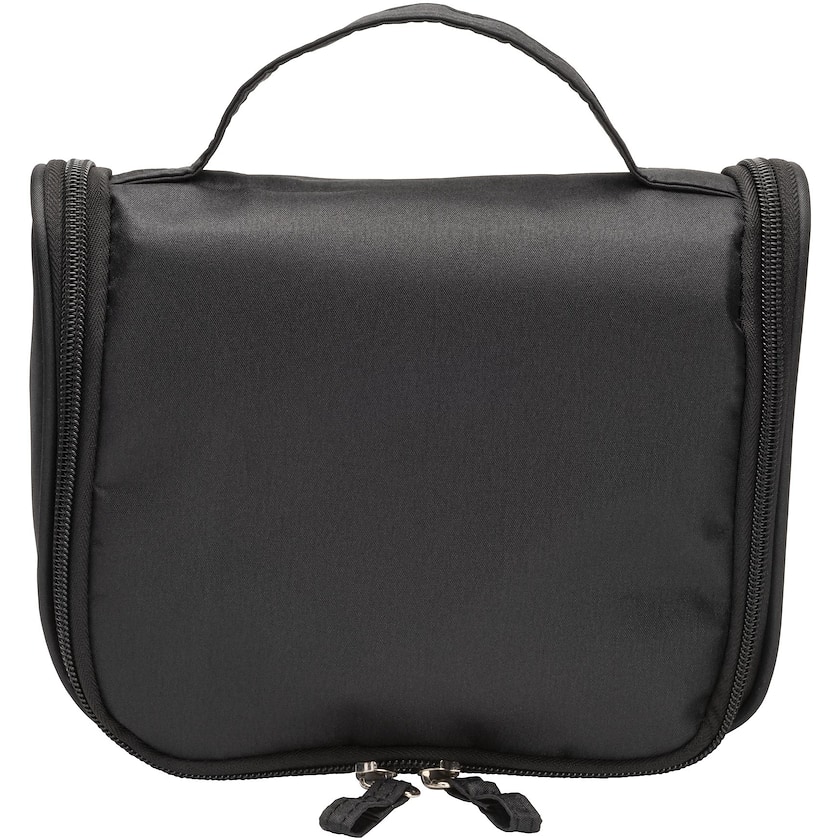 Geräumige Kulturtasche, die aufgehängt werden kann. Der Kulturbeutel hat zwei Reißverschlüsse. Es ist nur 1-farbiger Druck möglich.