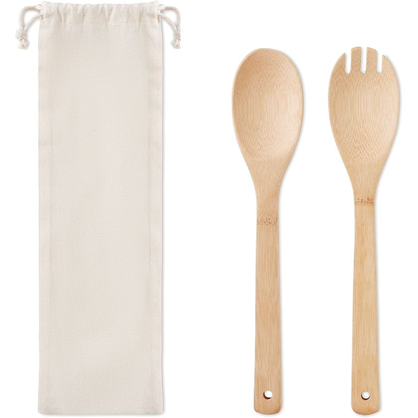 Sallatbestick aus Bambus. Geliefert in einem naturfarbenen Beutel. Der Druck erfolgt auf dem Beutel und die Lasergravur auf einem der Salatbestecke. Bambus ist ein natürliches Material, daher kann die Farbe leicht variieren.
