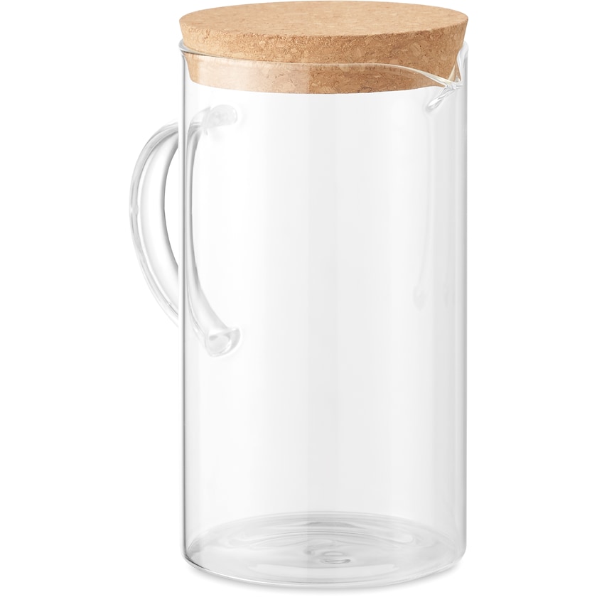 Glaskanne mit Korkdeckel. Eine schöne Glaskanne aus strapazierfähigem Borosilikatglas, die sowohl heißen als auch kalten Getränken standhält. Perfekt für den gedeckten Tisch. Nur 1-farbiger Druck möglich. Die Lasergravur erfolgt auf dem Kork.