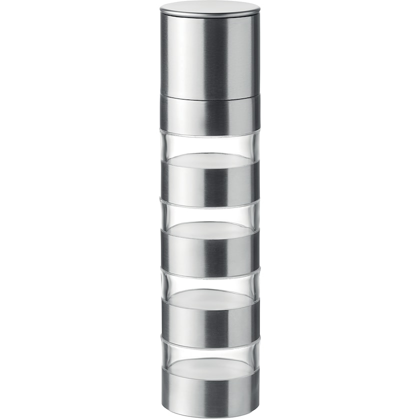 Pfeffermühle aus Edelstahl mit Platz für vier Gewürze. Hiro hat ein manuelles Keramikmahlwerk. Füllen Sie es zum Beispiel mit Salz, weißem Pfeffer, schwarzem Pfeffer und rosa Pfeffer. Beim 1-farbigen Druck beträgt die Druckfläche ganze 110 x 25 mm.
