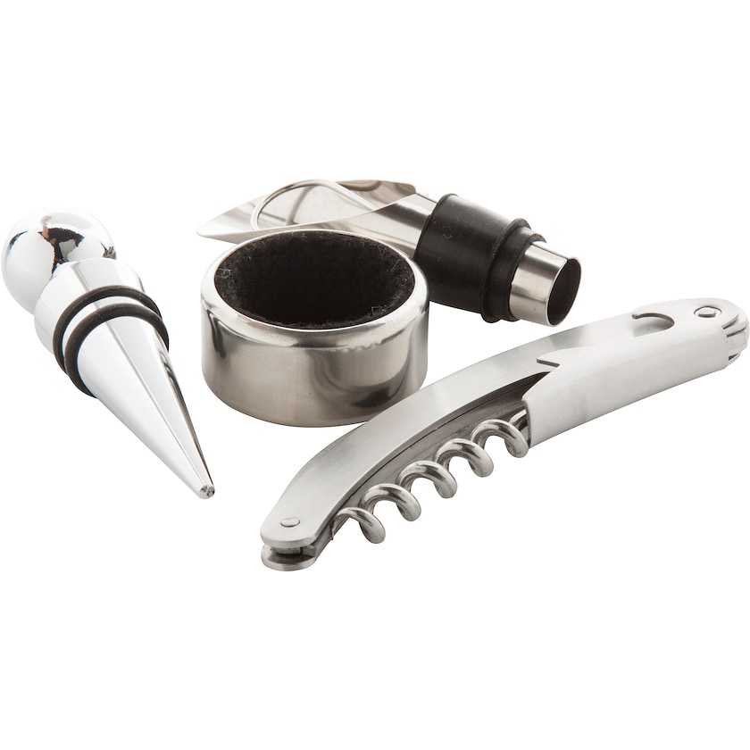 Weinset mit vier Teilen in Geschenkbox. Bestehend aus Korkenzieher, Flaschenverschluss, Tropfring und Ausgießer. Die Lasergravur erfolgt normalerweise auf dem Korkenzieher.
