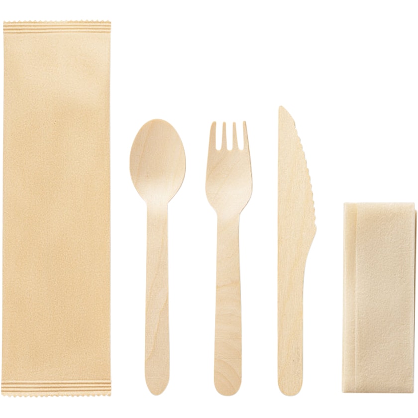 Einwegbesteck aus Holz. Beinhaltet Gabel, Messer, Löffel und Serviette. Wird in einzeln verpackten, naturfarbenen Papiertüten geliefert. Die Markierung erfolgt mit 4-Farbfotodruck in Form eines Etiketts, welches auf der Verpackung angebracht wird. Perfekt für das Firmenevent!