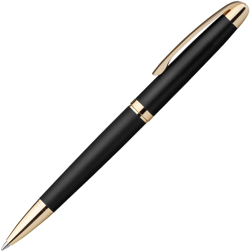 Kugelschreiber aus Metall mit goldfarbenen Details. Der Stift hat einen Drehmechanismus und kommt mit blauer Tinte. Der Kugelschreiber wird einzeln verpackt in einer schwarzen Pepierhülle geliefert.