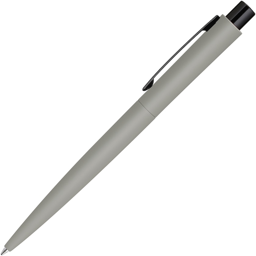 Metallstift mit mattem Soft-touch-Äußerem und Clip und Knopf glänzend schwarz. Das Logo wird entweder aufgedruckt oder aufgelasert.