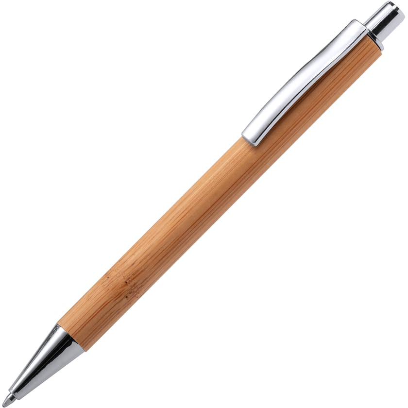 Stift aus echtem Bambus mit Details aus Metall. Simone hat blaue Tinte. Die Beschriftung kann wahlweise mit Druck- oder Lasergravur erfolgen. Ein stylischer Stift mit natürlichem Look.