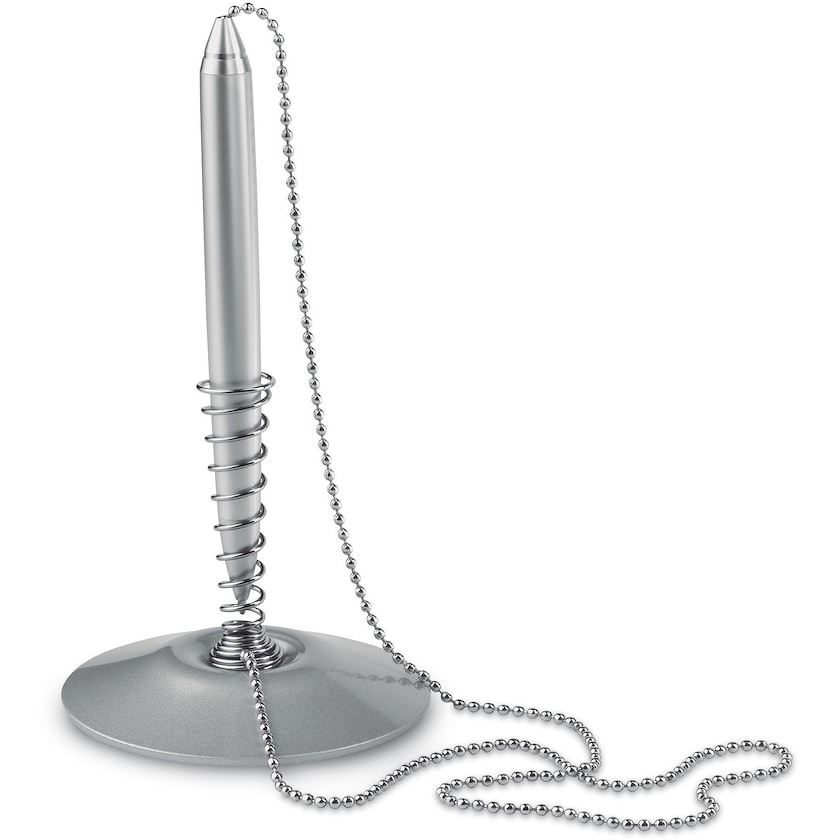 Kegelschreiber mit Kette und spiralförmigem Stifthalter. Ein hübscher Kugelschreiber aus Aluminium, schreibt mit schwarzer Tinte.