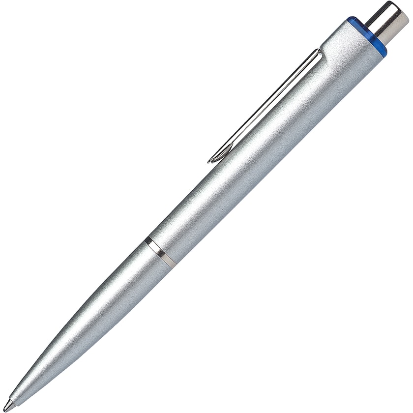 Eleganter Werbekugelschreiber mit silberfarbenem Stiftkörper. Clip, Ring und Druckknopf sind aus Metall. Der Stift ist mit der erstklassigen Tintenpatrone Schneider 774M ausgestattet.
