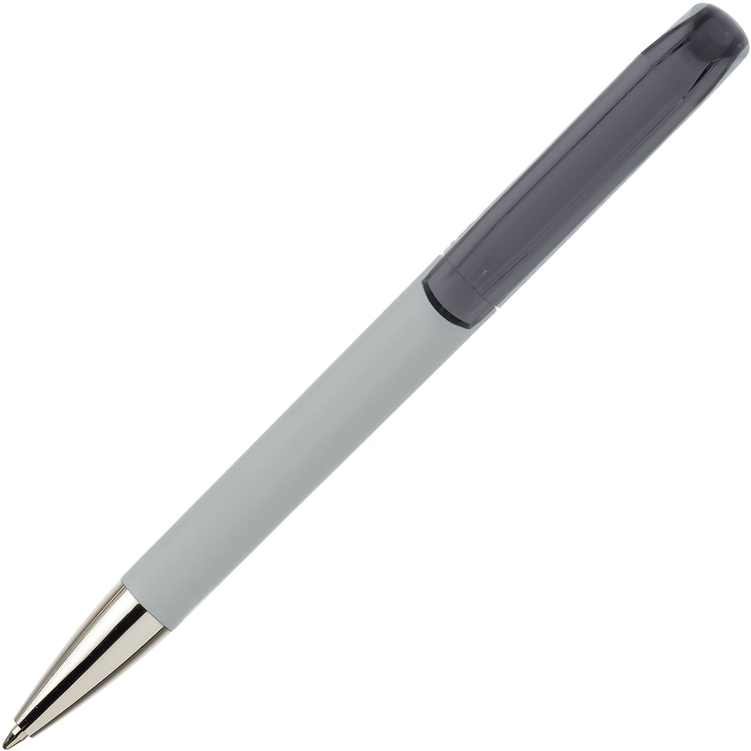 Hochwertiger Kugelschreiber mit gummiertem Stiftkörper. Der Kugelschreiber hat eine blankpolierte Spitze und einen transparenten Clip, der bedruckt wird.