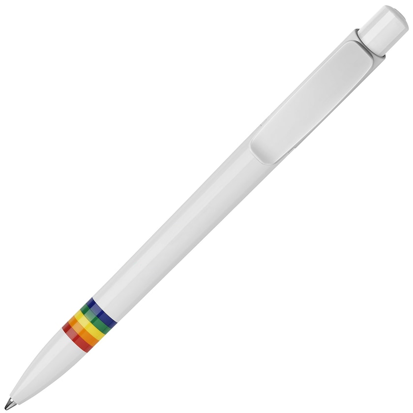 Werbekugelschreiber mit regenbogenfarbenem Detail an der Spitze. Der Kugelschreiber wird in Italien hergestellt und ist von höchster Qualität. Der Druck wird auf den Stiftkörper ausgeübt.