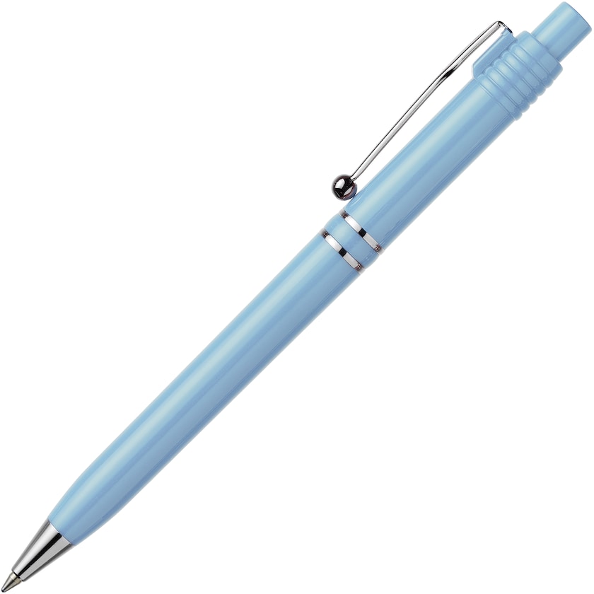 Eleganter Kugelschreiber mit besonderem Clip. Der Clip, die Spitze und die Ringe sind aus verchromtem Metall gefertigt. Die Tinte ist dokumentenecht nach ISO 12757-2. Der Stift wird in Europa hergestellt.