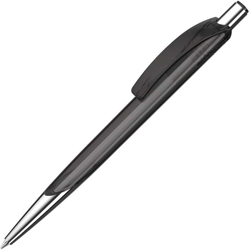 Kugelschreiber mit moderner Form und transparentem Stiftkörper. Der Stift hat eine elegante silberverchromte Spitze, eine große Druckfläche und einen attraktiven Preis. Die Tintenpatrone wird in Deutschland hergestellt und ist ISO-zertifziert.