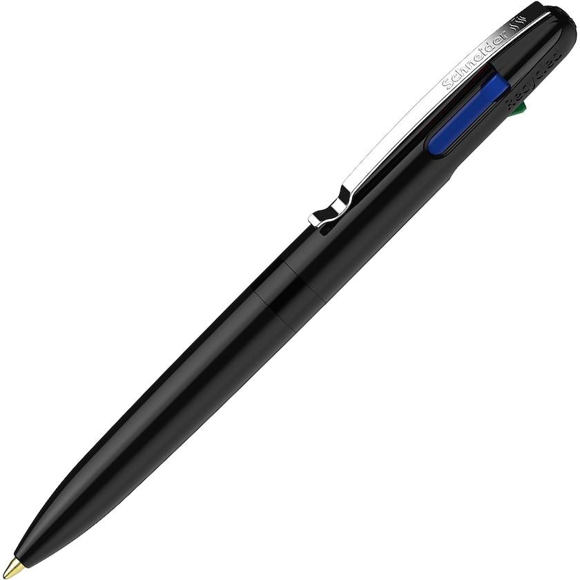 Kugelschreiber von Schneider mit vier verschiedenen Tintenfarben. Take 4 Promo hat die Tintenfarben Schwarz, Blau, Rot und Grün. Sie ändern die Farbe mit einem einfachen Knopfdruck. Der Stiftkörper besteht aus recyceltem Kunststoff und der Stift wird klimaneutral produziert.