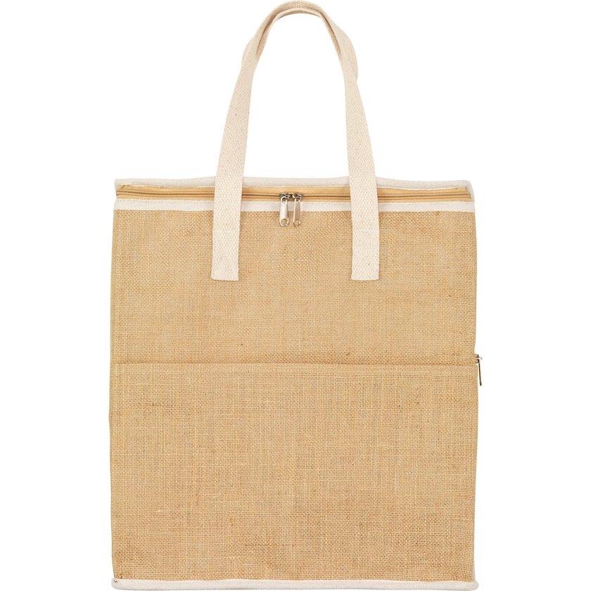 Große Kühltasche aus Jute und Baumwolle. An der Vorderseite gibt es zusätzlichen Stauraum für Dinge, die nicht gekühlt werden müssen. Die Kühltasche fasst 24 Liter. Es ist nur 1-farbiger Druck möglich.