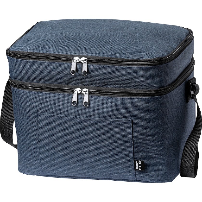 Geräumige Kühltasche mit Stoff aus recyceltem Material. Die Kühltasche hat zwei Reißverschlusstaschen und einen verstellbaren Schultergurt.