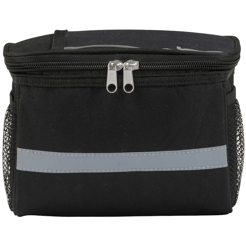 Kleine Kühltasche fürs Fahrrad. Die Kühltasche hat ein transparentes Fach auf dem Deckel. Praktisch für Handy oder Karten. Auf der Vorderseite gibt es ein Reflektorband.
