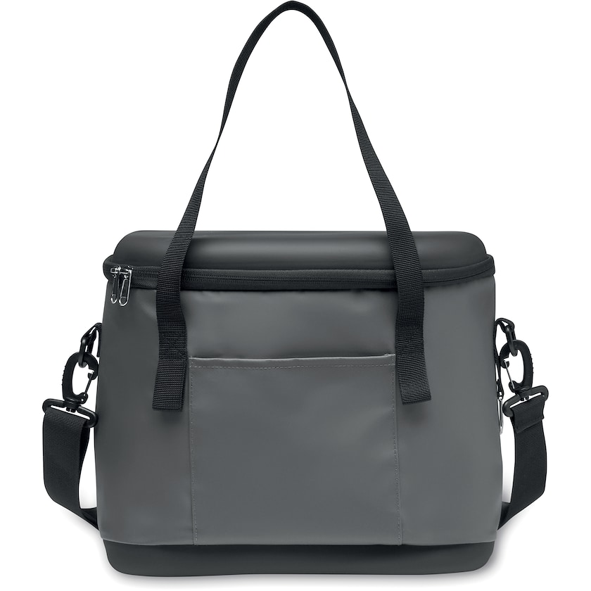 Exklusive Kühltasche. Auf der Vorderseite befindet sich eine praktische Außentasche, während im Inneren eine weitere Tasche für zusätzliche Ordnung sorgt. Ein integrierter Flaschenöffner macht die Tasche zum idealen Begleiter für unterwegs. Der Druck ist auf eine Farbe beschränkt.