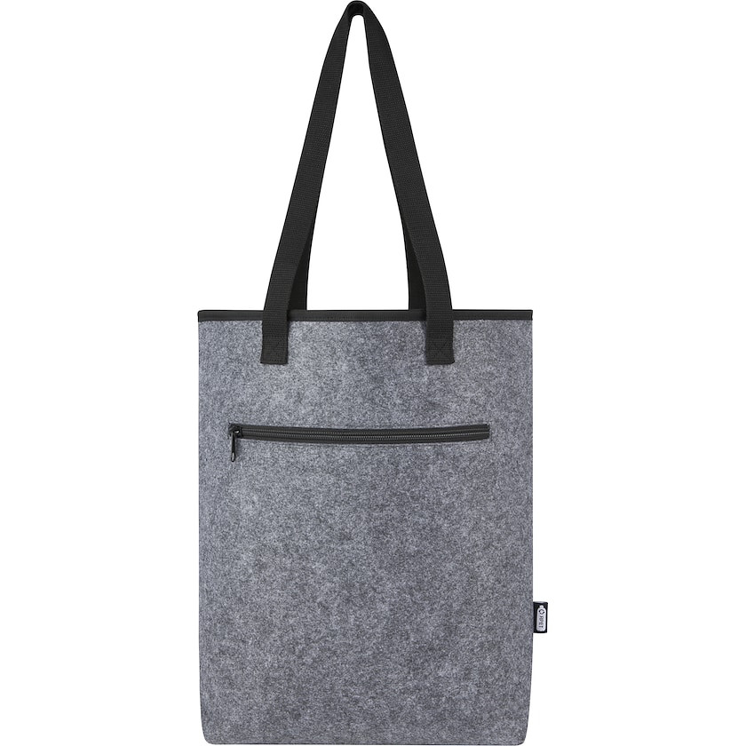 Kühltasche aus recyceltem Filz. Die Innenseite ist mit lebensmittelechter PEVA-Isolierung ausgekleidet. Die Griffe sind aus Baumwolle gefertigt. Auf der Vorderseite befindet sich ein Fach mit Reißverschluss.