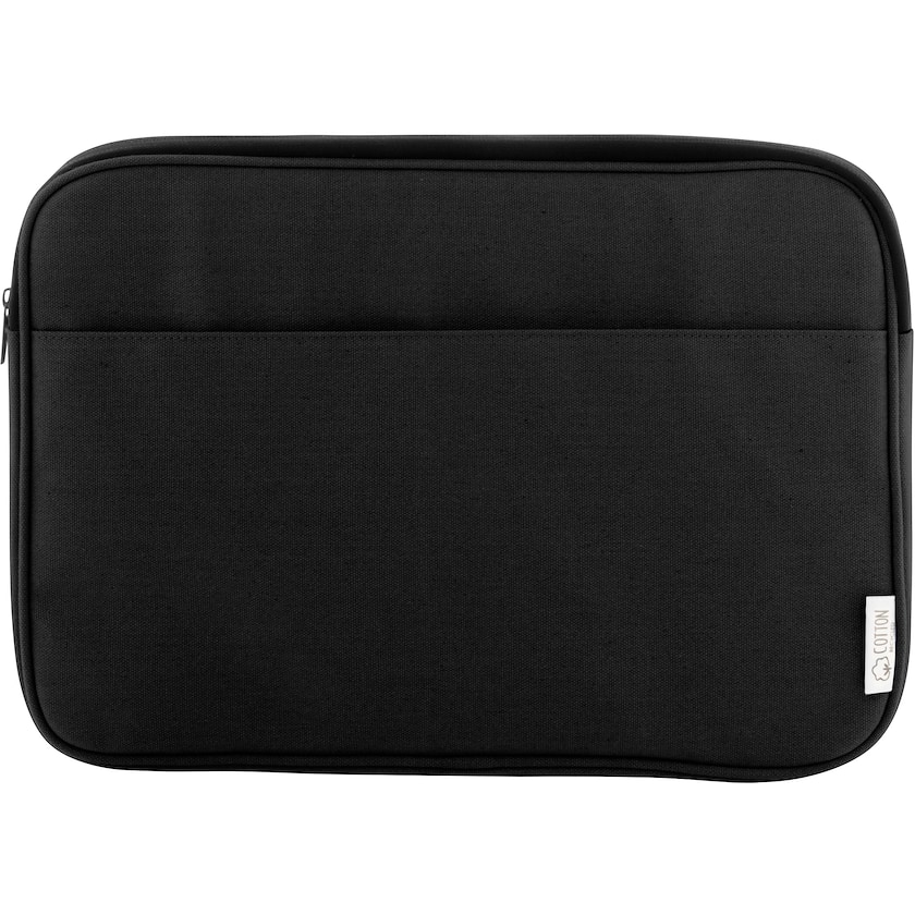Gepolsterte Laptophülle aus recycelter Baumwolle. Passend für Laptops bis zu 15 Zoll. Auf der Vorderseite befindet sich eine Tasche für kleinere Gegenstände.