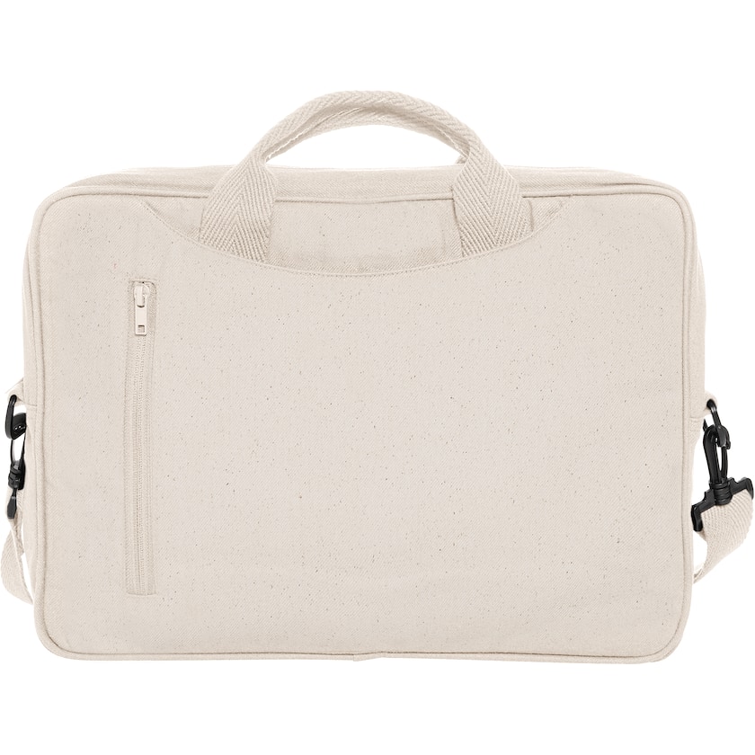 Computertasche aus recycelter Baumwolle. Im Inneren befindet sich eine gepolsterte Tasche, die Platz für einen 15,4-Zoll-Laptop bietet. Auf der Vorderseite befindet sich eine Reißverschlusstasche.