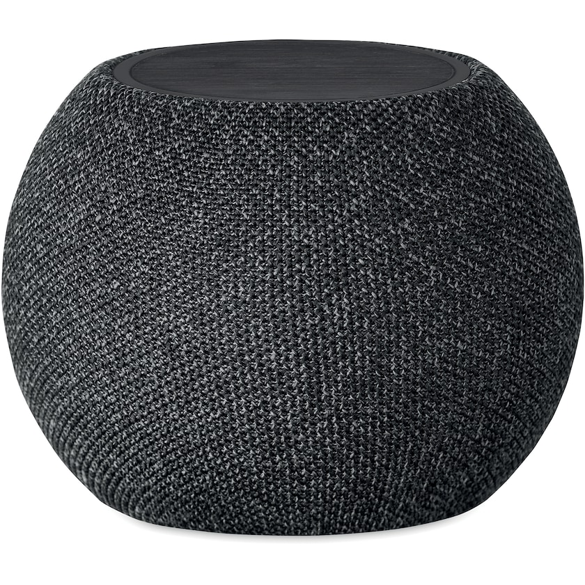 Kombinierter 5.0-Wireless-Lautsprecher und kabelloses Laden. Hergestellt aus ABS, RPET und schwarz lackiertem Bambus. Betrieb mit einem wiederaufladbaren Li-ION 1200 mAh-Akku SD-Karte und AUX-USB-Kabel im Lieferumfang enthalten. 5 Stunden Spielzeit. Die Beschriftung befindet sich auf der Oberseite des Lautsprechers.
