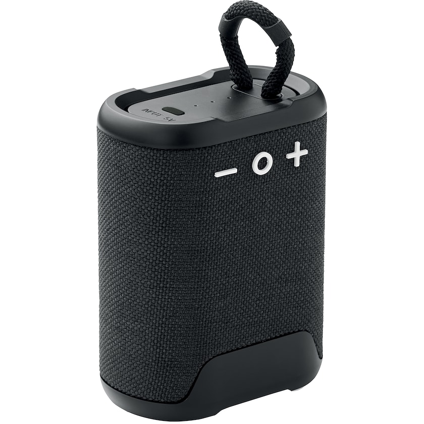 Wasserdichter kabelloser Lautsprecher. Der Lautsprecher besteht aus ABS mit Stoff aus 30 % Hanf und 70 % Polyester. Die Spielzeit beträgt 8 Stunden mit einer Ladung. Der Lautsprecher ist IPX7-wasserdicht, was bedeutet, dass er beispielsweise am Pool oder am Strand verwendet werden kann.