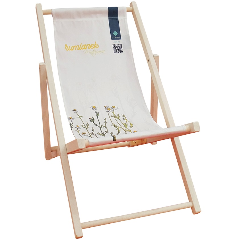 Klassischer Liegestuhl für Kinder. Der Liegestuhl hat kleinere Abmessungen als normal. Wählen Sie aus sieben verschiedenen Holzfarben. Der Stoff ist mit 4-farbigem Fotodruck bedruckbar.