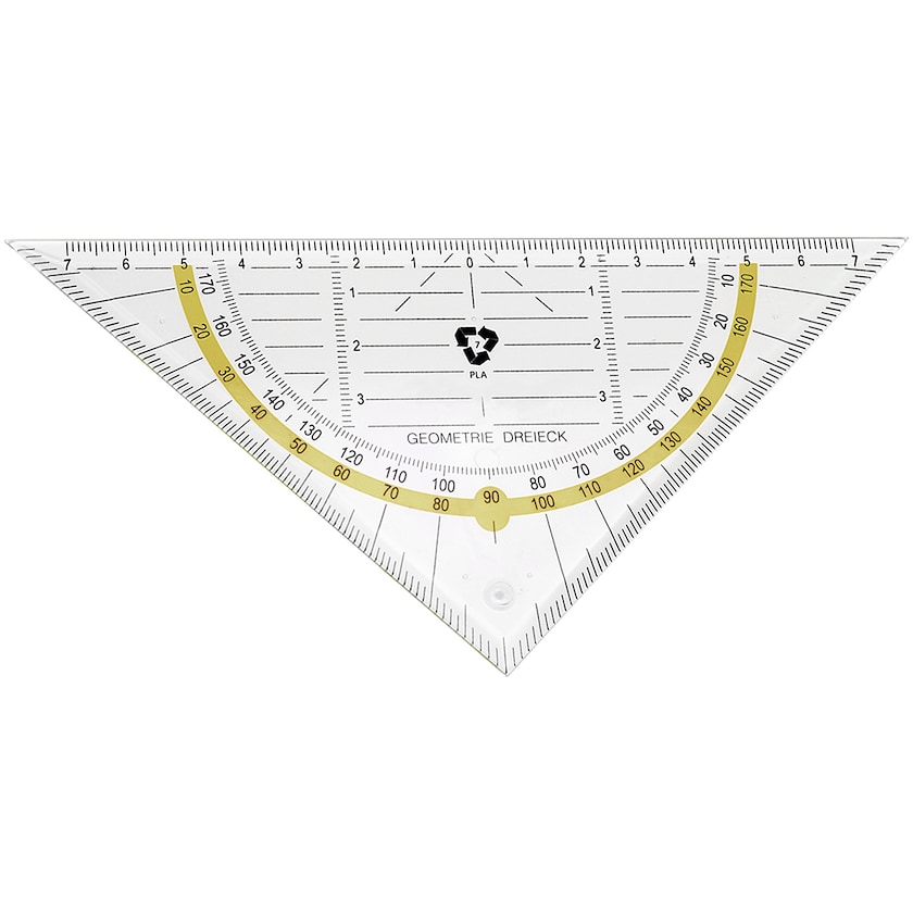 Ein Geodreieck für fortgeschrittenes Messen. Das Lineal hat eine 14-cm-Skala und eine farbige Skala zum Messen von Winkeln.