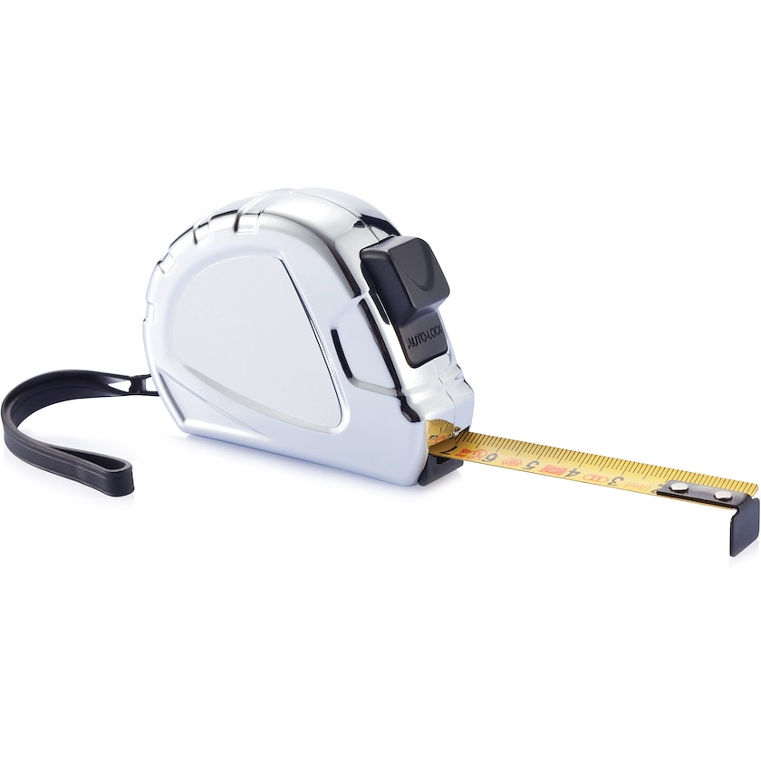 5-Meter Maßband mit elegantem Gehäuse aus Chrom. Crest hat ein gelbes Maßband aus Metall, welches den Richtlinien nach ECII entspricht. Auf der Rückseite befindet sich ein Gürtelclip.