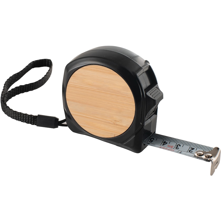 5-Meter-Maßband aus recyceltem ABS und Bambus. Geliefert wird im naturfarbenen Karton. Die Markierung kann entweder durch Druck- oder Lasergravur erfolgen.