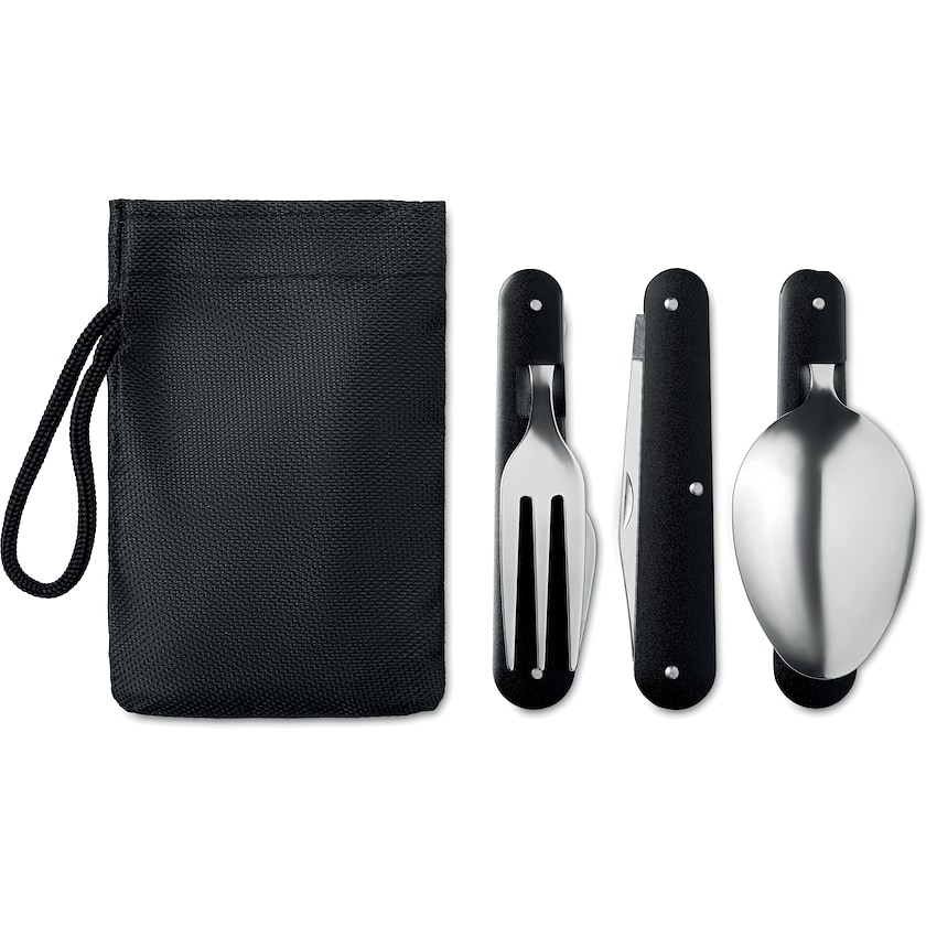 Campingbesteck aus rostfreiem Stahl. Das Set besteht aus Löffel, Gabel und Messer. Die Lieferung erfolgt in einem schwarzen Etui. Der Druck erfolgt auf dem Etui.