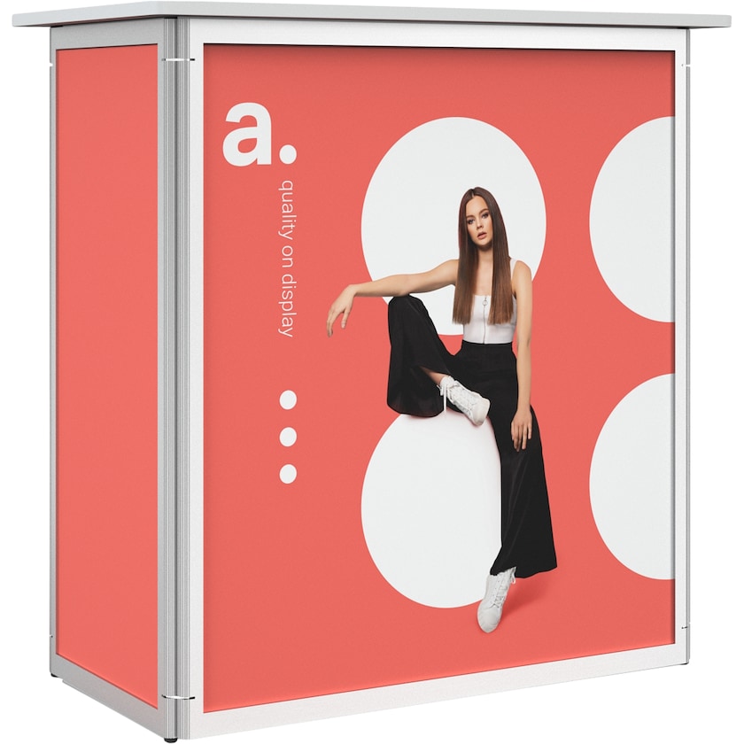 Hochwertiger, leicht zu montierender Messetisch. Der Druck erfolgt auf laminierten PVC-Folien, die in die Aluminiumstruktur eingearbeitet sind. Sie müssen nur den Ausstellungstisch aus dem Koffer heben, die Seiten aufklappen und die Struktur mit der Tischplatte und der Ablage verriegeln.