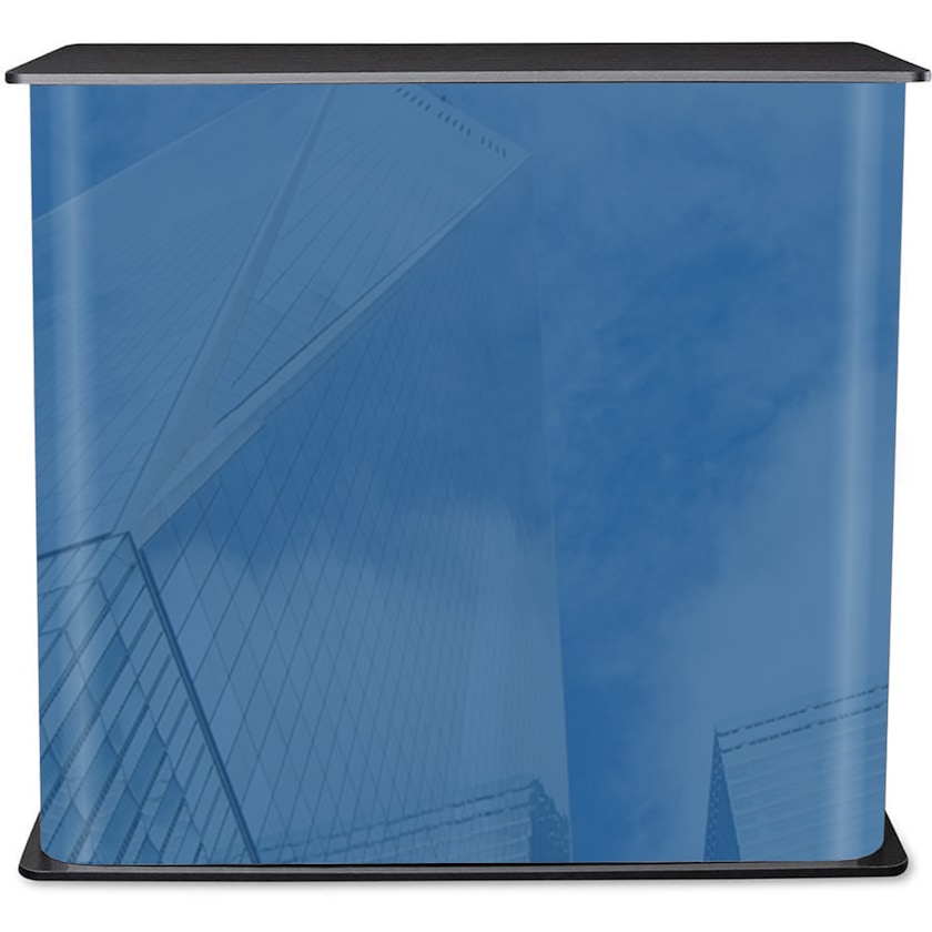 Rechteckiger Ausstellungstisch mit intelligenter Konstruktion. Der Expo Counter ist mit einer Holztischplatte und einer Unterseite aus klettbeschichtetem PVC ausgestattet. Der Druck erfolgt auf einer laminierten Folie, die über die Unterseite gelegt wird. Wählen Sie zwischen glänzender oder matter Laminierung. Tasche gratis inklusive.