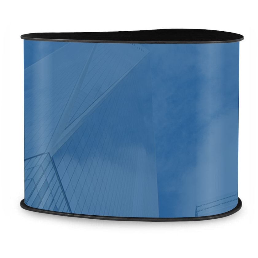 Großer gebogener Ausstellungstisch mit Schnellaufbau. Expo Large hat eine raffinierte Konstruktion mit einer Tischplatte aus Holz und einer Unterseite aus mit Klettverschluss bedecktem PVC. Der Druck erfolgt auf einer laminierten Folie, die über die Unterseite gelegt wird. Wählen Sie zwischen glänzender oder matter Laminierung. Tasche inklusive.