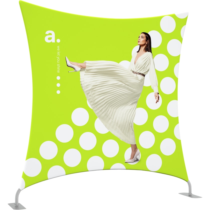 Innovative Ausstellungswand mit einer aufregenden Form. Die Ausstellungswand besteht aus einer ausgeklügelten Konstruktion von Aluminiumrohren, die mit einem Klick zu einem Bogen zusammengefügt werden. Die Montage erfordert kein Werkzeug. Nachdem der Bogen zusammengebaut ist, ziehen Sie einfach den Stoff darüber und schließen ihn mit einem Reißverschluss. Der Stoff ist auf der Vorder- und Rückseite mit Farbe auf Wasserbasis bedruckt. Der Stoff ist bei 30 Grad in der Maschine waschbar. Wenn Sie das Design in Zukunft ändern möchten, bestellen Sie einfach einen neuen Stoff.