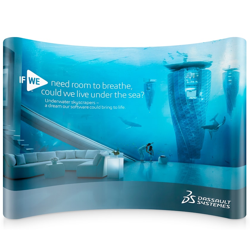 Große Messewand mit leicht gewölbter Form. Die Messwand Pop Up Large kann im Handumdrehen von einer Person ohne Werkzeug aufgebaut werden. Der Stoff hält mithilfe von Magnetbändern. Die Lieferung erfolgt in einer Aufbewahrungstasche mit Rädern. Der Druck erfolg auf der Vorderseite und den beiden Kurzseiten.