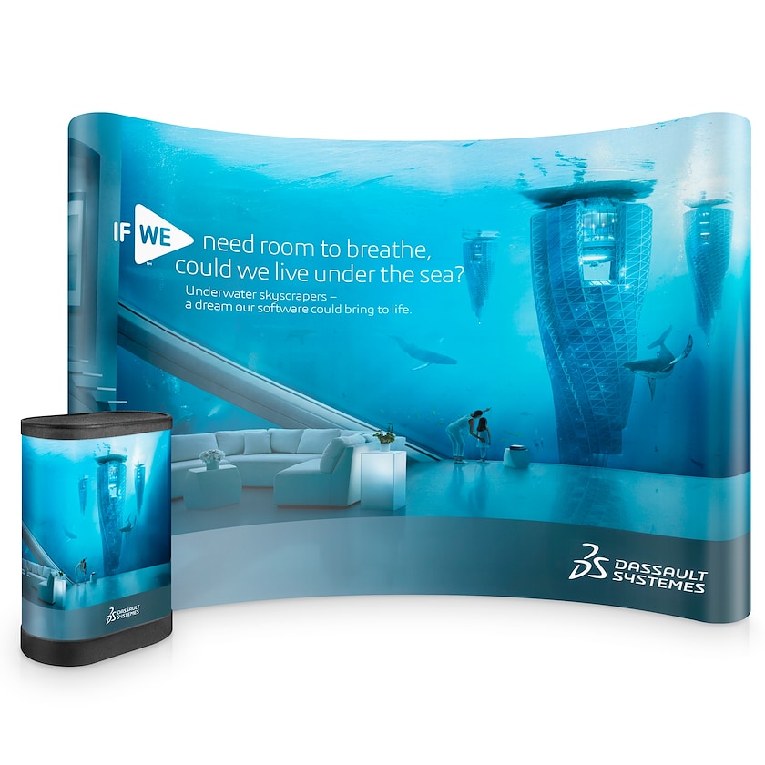 Set mit Pop Up Large, Messetisch und Beleuchtung. Die Messwand hat eine elegant geschwungene Form. Sie kann im Handumdrehen von einer Person ohne Werkzeug aufgebaut werden. Der Stoff hält mithilfe von Magnetbändern. Der Preis umfasst das Bedrucken von Messewand und Messetisch. Der Druck erfolg bei der Messewand auf der Vorderseite und den beiden Kurzseiten. Der Messetisch hat Räder und dient auch zur Aufbewahrung.