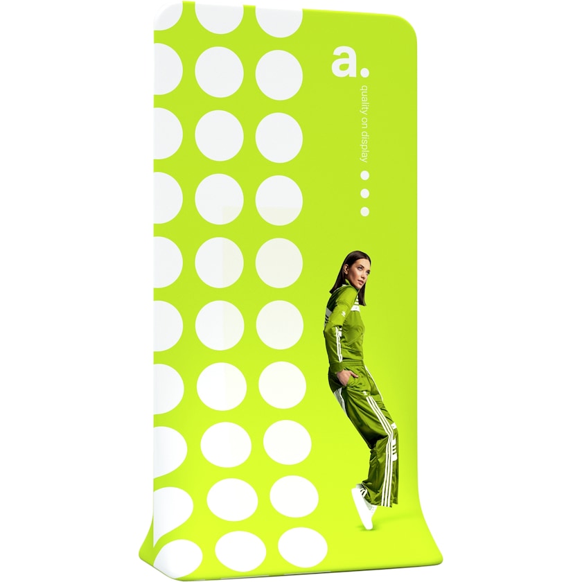 320 cm hohe, turmartige Stoffwand für alle, die gesehen werden wollen. Die Ausstellungswand hat eine innovative Konstruktion, die aus Aluminiumteilen besteht, die ohne Werkzeug zusammengesetzt werden. Die Aluminiumstruktur wird dann mit dem Stoff bespannt und mit einem Reißverschluss verschlossen. Wenn Sie den Stoff einmal austauschen möchten, bestellen Sie einfach einen neuen Stoff bei uns. Der Stoff kann in der Waschmaschine bei 30 Grad gewaschen werden. Der Druck erfolgt mit umweltfreundlichen Farben auf Wasserbasis.