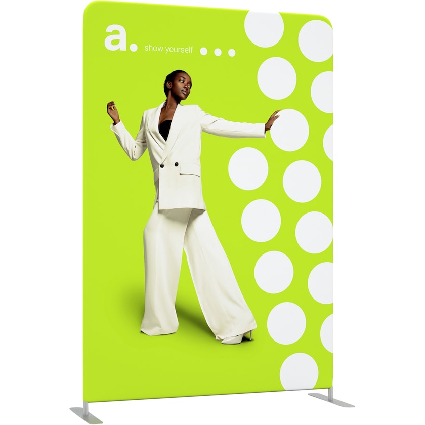 150 cm breite Ausstellungswand. Die Ausstellungswand hat eine einzigartige Konstruktion aus Aluminiumrohren, die sich zu einem Bogen zusammenklicken lassen. Die Montage erfordert kein Werkzeug und geht sehr schnell. Sobald der Bogen zusammengebaut ist, zieht man einfach den Stoff darüber, schließt ihn mit einem Reißverschluss und ist fertig. Der Druck erfolgt auf umweltfreundliche Weise mit Farben auf Wasserbasis auf der Vorder- und Rückseite des Stoffes. Bei Bedarf können Sie den Stoff bei 30 Grad in der Waschmaschine waschen. Wenn es an der Zeit ist, das Motiv zu erneuern, bestellen Sie einfach einen neuen Stoff bei uns. Umweltfreundlich und kostengünstig!